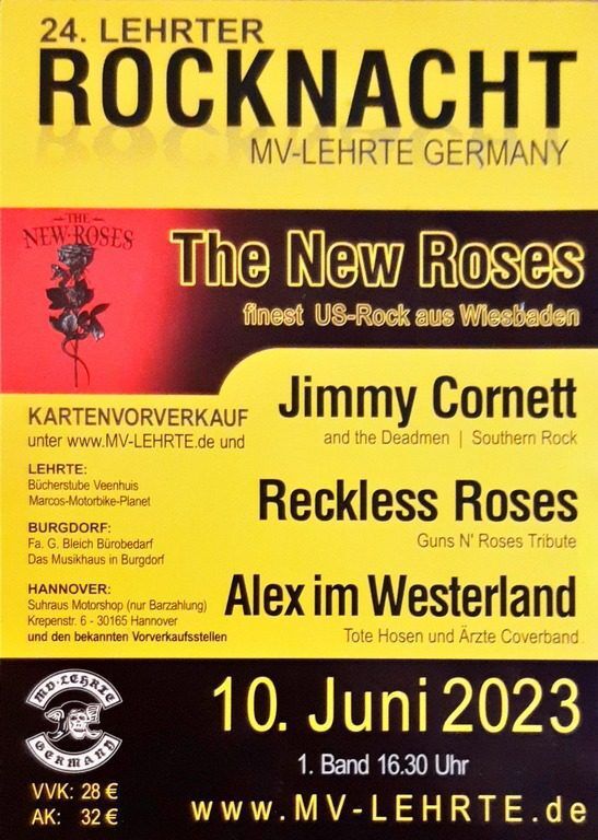 Nach Alex im Westerland wird im Anschluss „Reckless Roses“ auf der 24. Lehrter Rocknacht auftreten. Diese seit 20 Jahren beliebte Band aus Budapest hat es sich zum Ziel gesetzt, die weltweit authentischste und beste Tribute-Band von Guns N‘ Roses zu sein. Mit beeindruckenden 400 Shows in 22 Ländern haben sie bereits eine enorme Bühnenerfahrung gesammelt. Nun freuen sie sich darauf, ihr Können auch in Lehrte zu präsentieren und das Publikum mit ihrer Darbietung zu begeistern.
