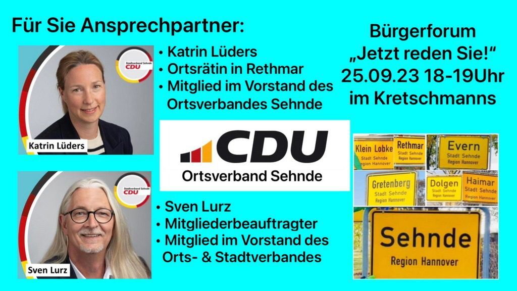 Nutzen Sie diese Gelegenheit, Ihre Stimme zu erheben und aktiv an der Gestaltung Ihrer Gemeinde teilzunehmen. Der CDU Ortsverband Sehnde freut sich auf einen spannenden und konstruktiven Austausch.