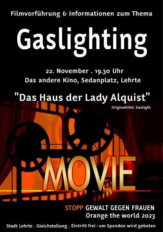Im Rahmen der UN-Women-Aktion »Orange The World – Stopp Gewalt gegen Frauen« lädt die Gleichstellungsbeauftragte der Stadt Lehrte am 22. November 2023 in »das Andere Kino« in Lehrte ein. Dort findet um 19.30 Uhr eine Filmvorführung und Informationsveranstaltung zum Thema »Gaslighting« statt.