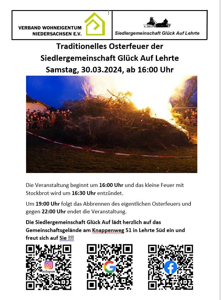Die Veranstaltung klingt gegen 22:00 Uhr aus. Die Siedlergemeinschaft Glück Auf freut sich auf Ihr Kommen und darauf, gemeinsam mit Ihnen ein geselliges Osterfeuer-Fest zu erleben.