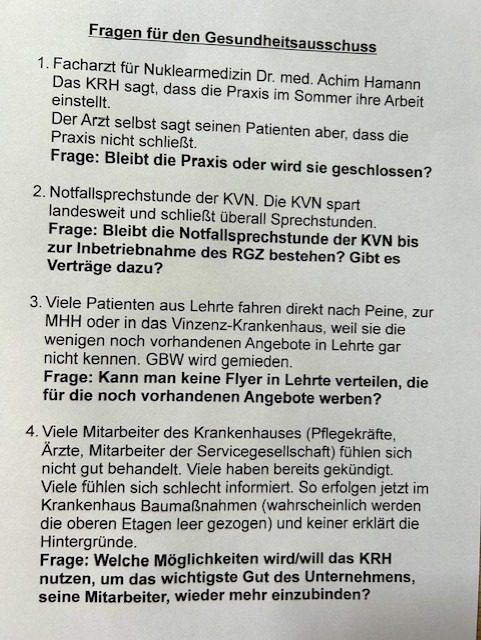 Die Frage nach der Notfallsprechstunde der KVN wird durch Krach und Schulte nicht beantwortet. Die Fragestellung der CDU-Fraktion verstärkt meinen Eindruck. Diese wichtige Leistung für die Lehrter Bürger ohne Krankenhaus ist nicht abgesichert. Die KVN soll eingeladen und meine Fragen durch die Region schriftlich beantwortet werden.