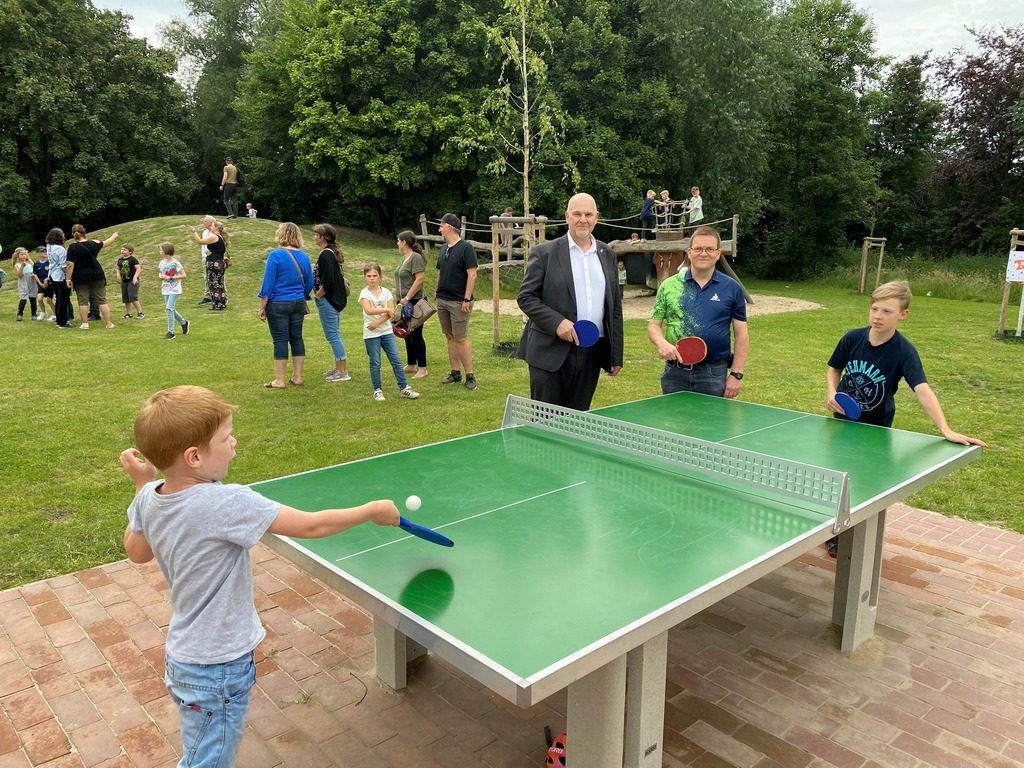Der Bürgermeister ließ es sich ebenso nicht nehmen, der Grundschule zusätzlich vier Outdoor-Schläger und Bälle zu schenken. Anschließend spielte er einige Runden Tischtennis mit den Kindern, die sichtlich Freude an der neuen Sportmöglichkeit hatten.