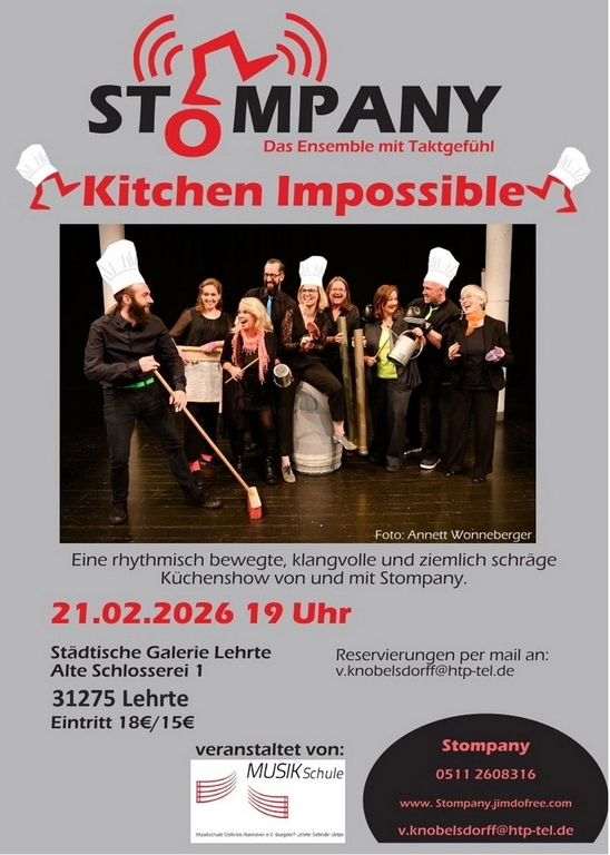 Am 21. Februar 2026 um 19.00 Uhr gastiert das Ensemble Stompany auf Einladung der Musikschule Ostkreis Hannover in der Städtische Galerie Lehrte. Das Publikum erwartet eine ebenso rhythmische wie ungewöhnliche Küchenshow – klangvoll, bewegungsreich und bewusst schräg.